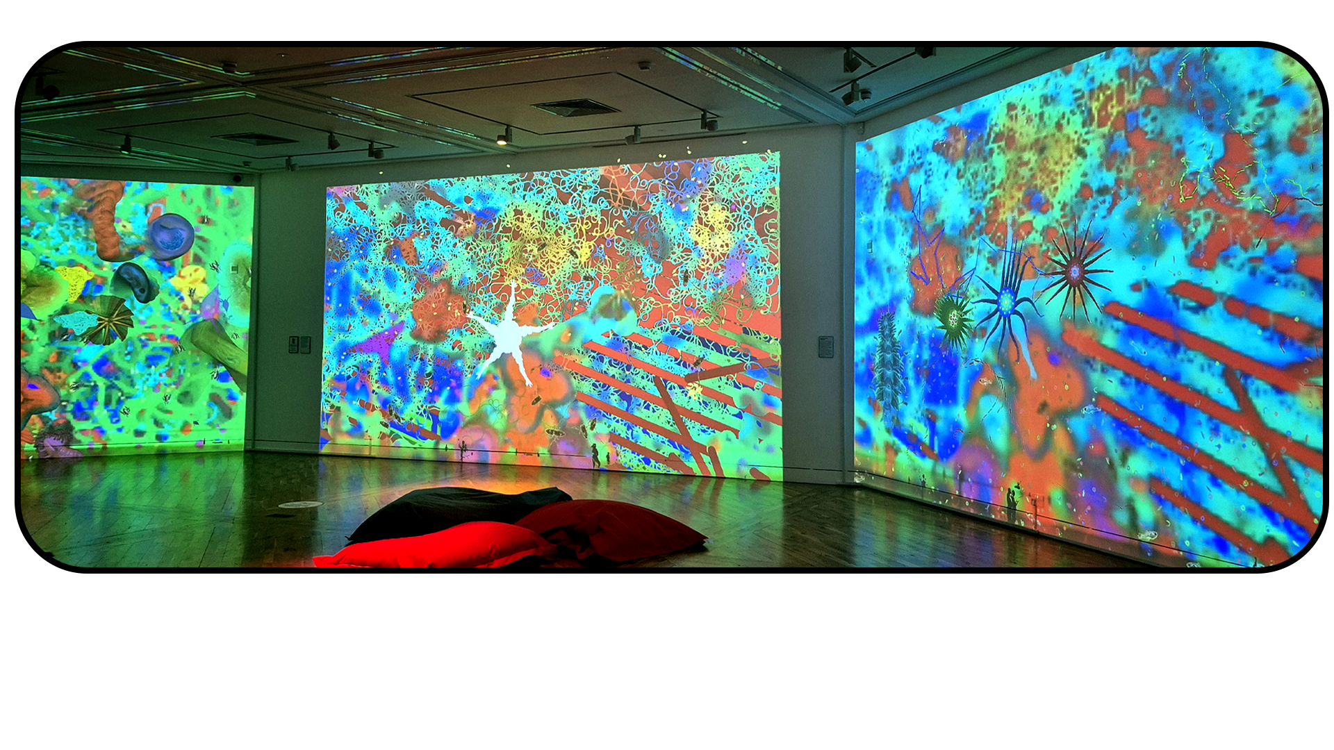 Explore a colourful digital aquarium through multiple interconnected, interactive projections that send the action from one screen to the next in a continuous cycle.